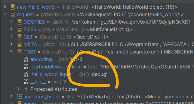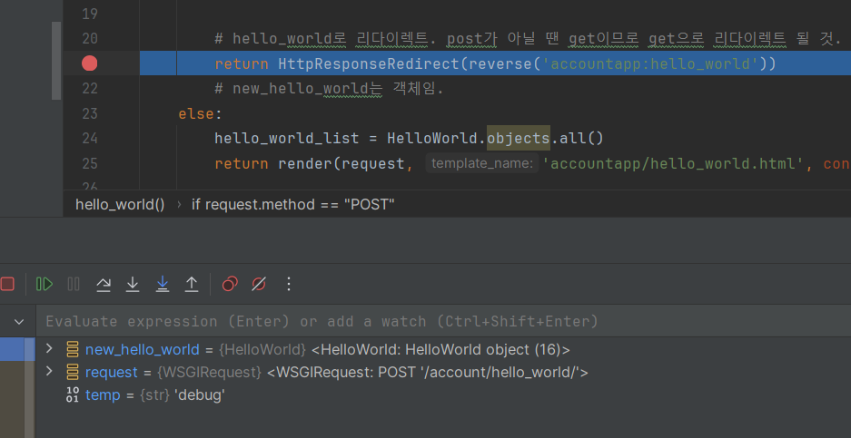 정지점을 누른 곳이 post의 리턴이므로, debug를 작성하고 post를 해보면?